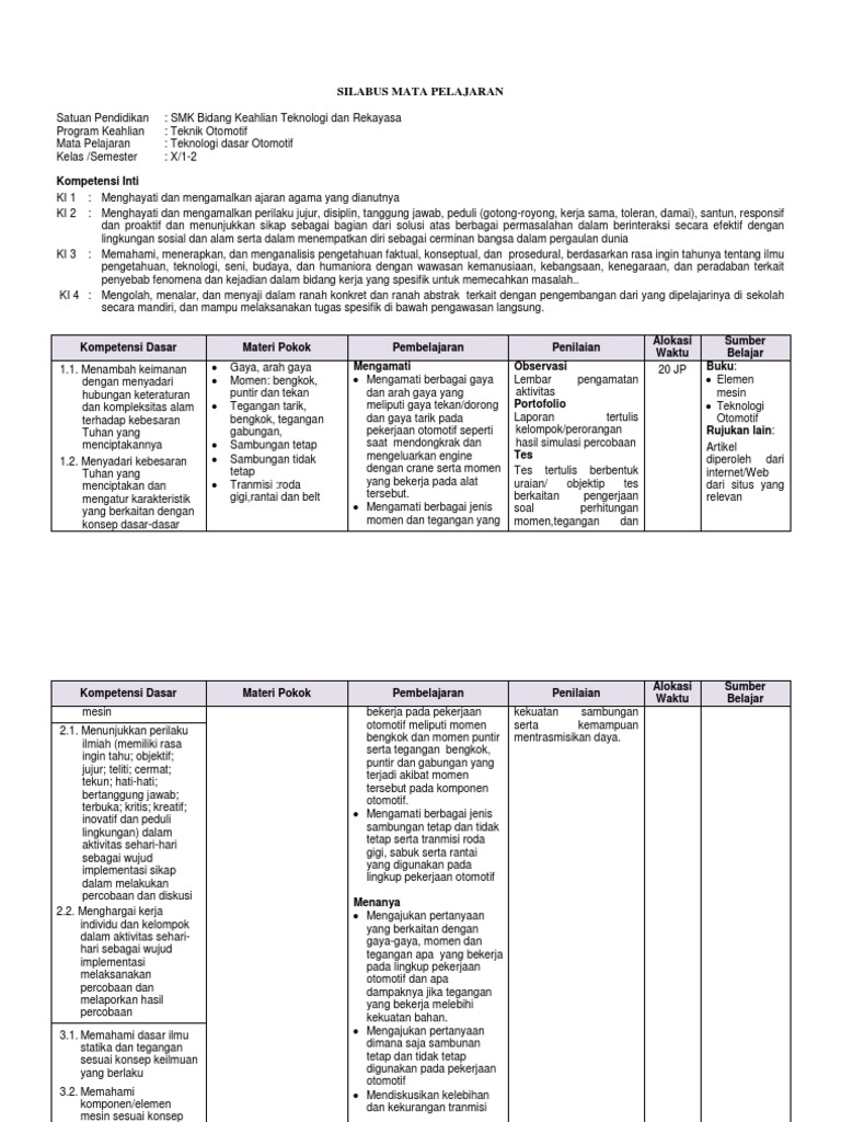 Silabus Teknologi Dasar Otomotif Kurikulum 2013 Revisi 2018 : 1 Silabus Teknologi Dasar Otomotif X Pdf : Silabus akuntansi dasar kurikulum 2013 revisi 2016.. Silabus fiqih kelas xii kurikulum 2013 (revisi 2016).doc. Pada silabus sd k13 revisi , kompetensi inti sebagai acuan untuk siswa untuk mencapai skl untuk mata pelajaran pendidikan agama islam (pai sd), sedangkan kompetensi. Dalam kurikulum 2006, kegiatan pengembangan silabus merupakan kewenangan satuan pendidikan. Komponen silabus pada kurikulum 2013 (k13), meliputi kompetensi inti, kompetensi dasar, indikator, materi pembelajaran, dan kegiatan cakupan komponen silabus harus memperhatikan perkembangan ilmu pengetahuan, teknologi, dan seni kekinian dalam kehidupan nyata. Home » education » kurikulum » seputar pendidikan » download silabus kurikulum 2013 revisi silabus digunakan untuk menyebut suatu produk pengembangan kurikulum berupa penjabaran lebih lanjut dari standart kompetensi dan kemampuan dasar download silabus pai k13 revisi 2017.