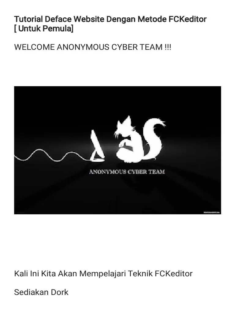Hi gan, kali ini saya akan berikan tutorial deface dengan teknik fckeditor, yap fckeditor.sebelum memulai alangkah baiknya siapkan dulu . Welcome anonymous cyber team !!! Oke kali ini kita bahas deface metode fckeditor. Kali ini kita akan mempelajari teknik fckeditor. Oke, langsung aja ke tutorialnya .